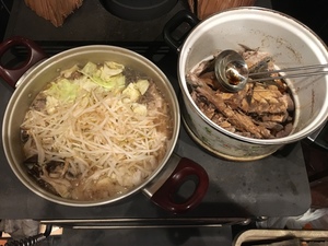 はい!出来上がり!ものの15分くらいでもつ鍋完成です(^^)となりの鍋は月曜日の夕飯のカンパチのあら炊き