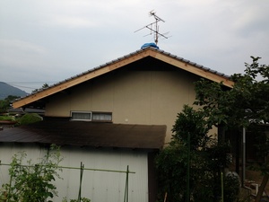 今日は、棟瓦を積む作業と玄関と浴室廻りの外装下地モルタル塗りと内部のクロス貼りと私達は、現場の残材引きあげと片付けです。今日も太陽さんは、なかなかの強敵でアルミ脚立を素手で持とうとすると熱くて持てません。当然瓦も持てません。