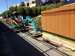 今日は、前面道路と敷地の間の砂利が敷いてある部分にコンクリートを打設する工事です。
