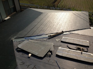 瓦屋さん5人でコロニアルはほとんど葺きあがりました。明日は残りのコロニアル葺きと隅棟と棟の笠木板金工です。