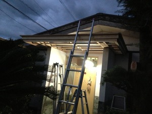 玄関庇をほとんど解体し既存の桁を補強して破風板を取付けました。