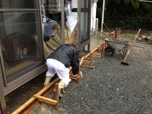 今日は、犬走りのコンクリート打設工事です。生コン屋さんも忙しいらしくなかなか生コンの予約が取れず型枠を入れてから