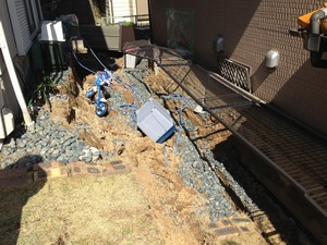 自然の猛威というか自然の力はすごいですね。でも柱が折れてなくてよかった。修理するにも柱が折れていると柱の抜き替えや家の倒れやねじれを直すのにかなりの費用がかかります。この土やブロックを取り除けば柱は元に戻ります。修理は外壁とサッシと雨樋などを修理しないといけないでしょう。