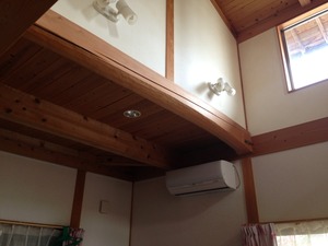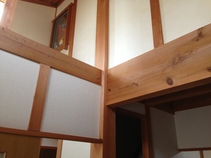 この写真がリビングの吹き抜け部分の写真です。桧の太鼓梁が安心感があり本当に落ち着くし、癒される空間になっています。お客様も構造材がむき出しになっているので安心感もあるし、飽きがこないとおしゃっていました。建てた私達には、本当に嬉しいお言葉でした!