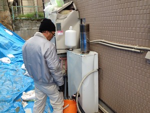 壊れてしまった電気温水器を撤去して仮設の石油給湯器に切り替えます。外壁の復旧工事が終わったら新しいエコキュートに切り替えます。