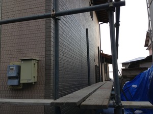 お客様が住んでいらっしゃるので既存の外壁を一日で張れる分だけ履いで張替えます。10年前と同じサイディングはないので張替えてもおかしくないデザインのサイディングを張ります。