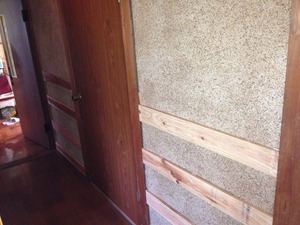 この腰壁に杉板のウズクリ(研ぎ出し)を張っていきます。