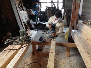 鑿(ノミ)や鋸ぎり(ノコギリ)電動工具を駆使して刻んでいきます。