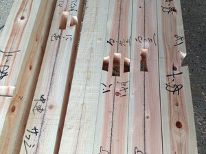 土台の刻みが終わった写真です。土台が全て刻みが終わったら母屋(モヤ)の墨付と刻みです。母屋とは、屋根を構成するために欠かせない部材です。また墨が付いたらブログにアップしていきますね~。来週には、桁材や梁材が入って来るので早く母屋を刻んでしまわないと。