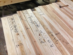 真ん中に置いてある図板を見ながら桁材の1本1本の癖や曲がりなどを見て適材適所に使えるように墨を付けていきます。