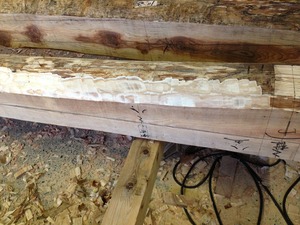 梁にちょうなという道具を使って『なぐり仕上げ』をしました。