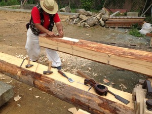 6mの梁を刻んでいます。差し金という道具を使ってちゃんと90度になっているか確認している写真です。