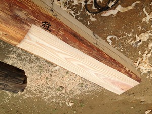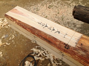 カンナがけが終わると柱のホゾ穴の墨を付けてホゾ穴を刻んでいきます。
