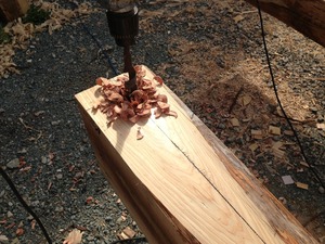 ドリルでの穴堀が完了しました。この状態から鑿(ノミ)でホゾ穴を掘っていきます。ホゾ穴堀が完了したらまたアップしますね~。