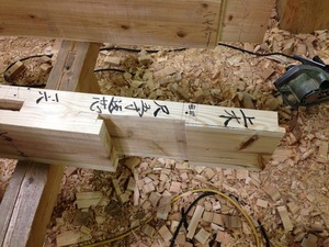 桁の継手の仕口ですべり継ぎの刻みの様子です。