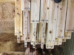 以前ブログで梁のボソ穴を刻んでいる様子をアップしましたよね?あのホゾ穴に3本ある重ボソの中で1番細い重ボソがあの梁に差さります。また現場で納まった状態をアップしますね~。