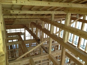 これが2階の梁組です。小屋組は胴差、小屋梁、二重梁、三重梁、三引とこの家にも屋根の小屋組は和小屋組でしっかり組んでいます。