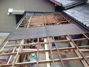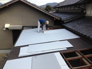既存屋根の波トタンを剥いで新しいガルバニウム鋼板の波板に張替えます。31年たつとかなり錆びていますね。