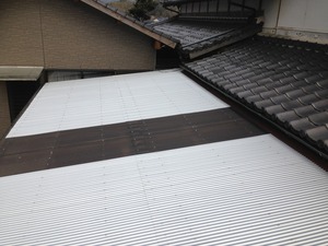 既存の波板を剥ぎ終わった写真です。真ん中の波板はポリカーボネードの波板に張替えていたので今回は張替えずに波トタンの部分のみ張替えます。