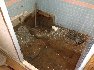 既存の浴槽を撤去して土間のタイルも割って撤去してユニットバスを設置する為その下の埋土を撤去している様子です。狭いので浴室に1人しか入れず作業もなかなかの重労働です。