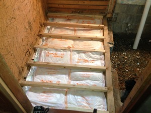 この写真は洗面脱衣室の床根太を組んで断熱材を充填している様子です。