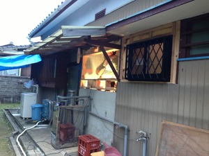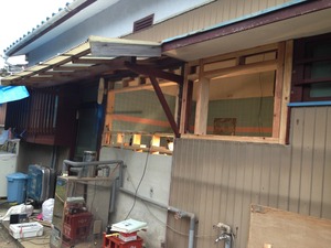 内部の床組み工事と平行して外部のサッシの下地組み工の様子です。既存の木建具を撤去してペアガラスサッシを取り付けます。