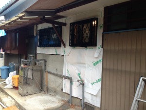 外部の壁に通気シートを張りました。次の日は、外壁仕上げ材の焼杉板を張ります。