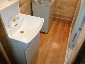 洗面脱衣室の床の完了写真です。床板は無垢材の桜のフローリングです。