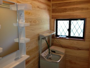 洗面脱衣室の壁の完了写真です。壁板は杉の無垢材を張っています。湿気が多い場所なので杉板が調湿してくれると思います。