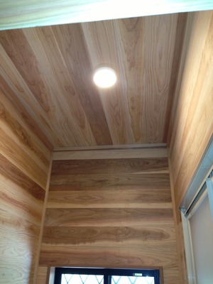 洗面脱衣室の天井も杉の無垢板を張っています。