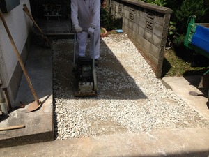この写真は、再生クラッシャーランを敷きならした後プレートという機械を使って土間を転圧(突き固めて)している様子です。この作業が終わると土間の工事完了です。