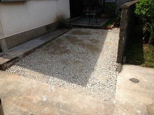 この間敷いた門柱とスロープ土間コンクリートを細かく砕いた割りグリ石がわりの上にこれもまた再生クラッシャーランというコンクリートを細かく砕いたリサイクル砂利を敷いて仕上げている様子です。コンクリートの土間より予算も押さえられますし、作業手間も押さえられます。