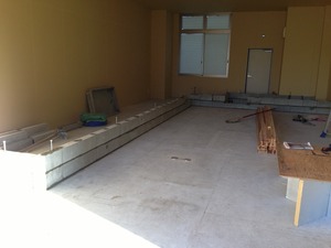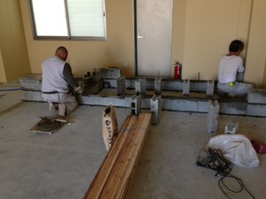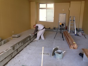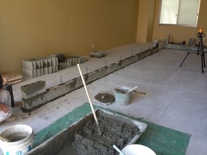 厨房と客室の仕切りのブロックを一段築いた様子です。