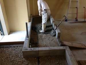 この写真は、トイレの生コン打設の様子です。こちらは床に水を流すことがないので水平に生コンを左官さんが金ゴテ
