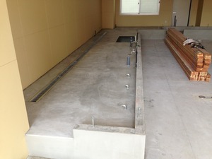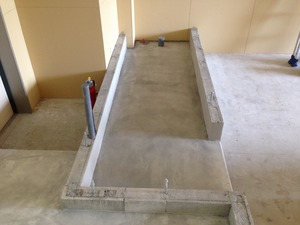 この写真は、厨房の生コン打設の様子です。U字溝を入れていますので水勾配はU字溝に流れるようになっています。