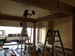 この写真は、店舗の客室の間仕切りを桁と梁組で作るため梁を打ち込んでいる様子の写真です。