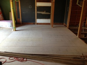この写真はリビングに変わる床の下地合板張りの様子です。この上に床暖房のキットを張ってフローリングを
