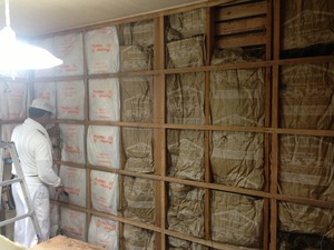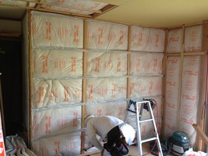 この写真は、解体した壁に既存の断熱材が入っていますがその上にさらに10センチの断熱材を充填している様子の写真です。こうすることでさらに断熱効果を上げて壁を仕上げます。