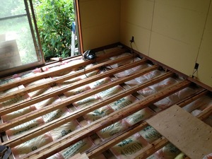 この写真は洋室の床に断熱材を充填して根太を補強している様子の写真です。