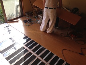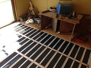 この写真は洋室の床に断熱材を入れて根太を補強した後に下地合板を張って床暖房用のフィルムを張っている