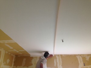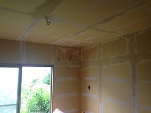 この写真は壁と天井のパテ処理が完了した写真です。パテが乾いたら仕上げのクロスを貼っていきます。