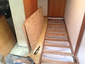 3分の2の床下地合板張りが完了しました。次は流し台を仮移設して流し台の下の床も同様に下地合板を張って