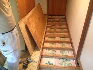 断熱材を充填したら床下地合板を張って、次の3分の1の既存の床を剥いで同じ工程を繰り返して