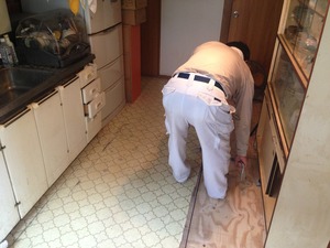 ダイニングキッチンの床は食器棚などがあるので3分の1づつ既存床を剥いでいきます。