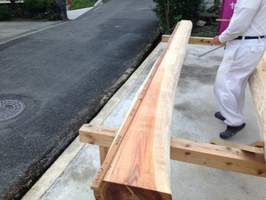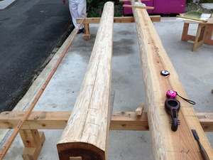 まずは、搬入した6Mと4Mの太鼓梁の薄皮を電気鉋(ガンナ)で削っていきます。