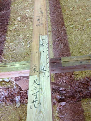 棟上げの日にちも決まり墨付けもいよいよ梁材の墨付けにかかっています。