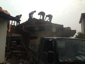 この写真は、屋根瓦を2tダンプに降ろしている様子です。機械でバラバラに解体するのではなく