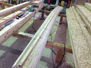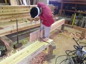 この写真も桁の継手を刻んでいる様子です。。いろんな道具を使って刻んでいきます。