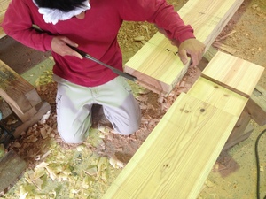 この写真は桁の継手を切込みしている様子です。突き鑿と言う道具を使って刻んでいる様子です。