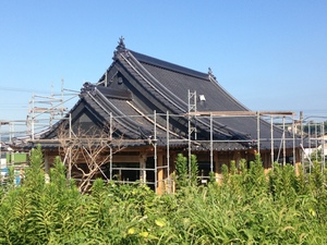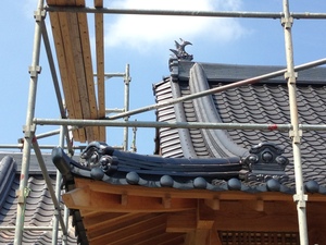 この間、屋根瓦の地瓦葺きをアップしたので今回は下り棟や隅棟やミノ甲や棟瓦葺きが終わった様子を
